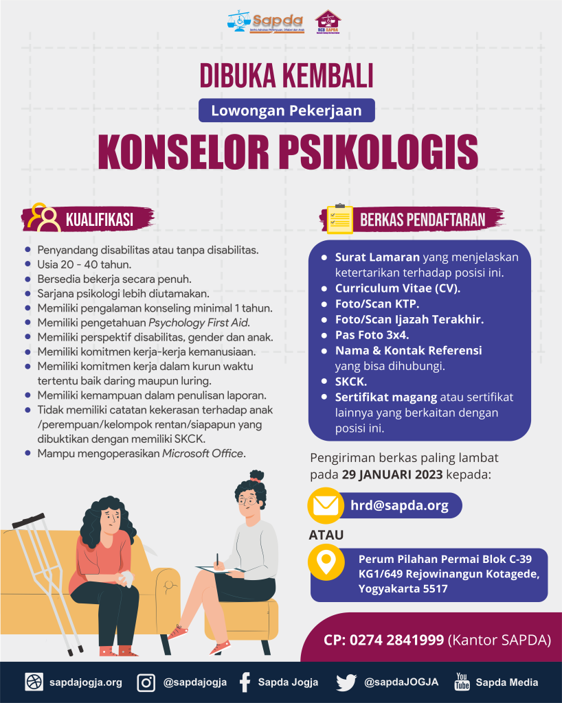 Lowongan pekerjaan Konselor Psikologis Yayasan SAPDA.